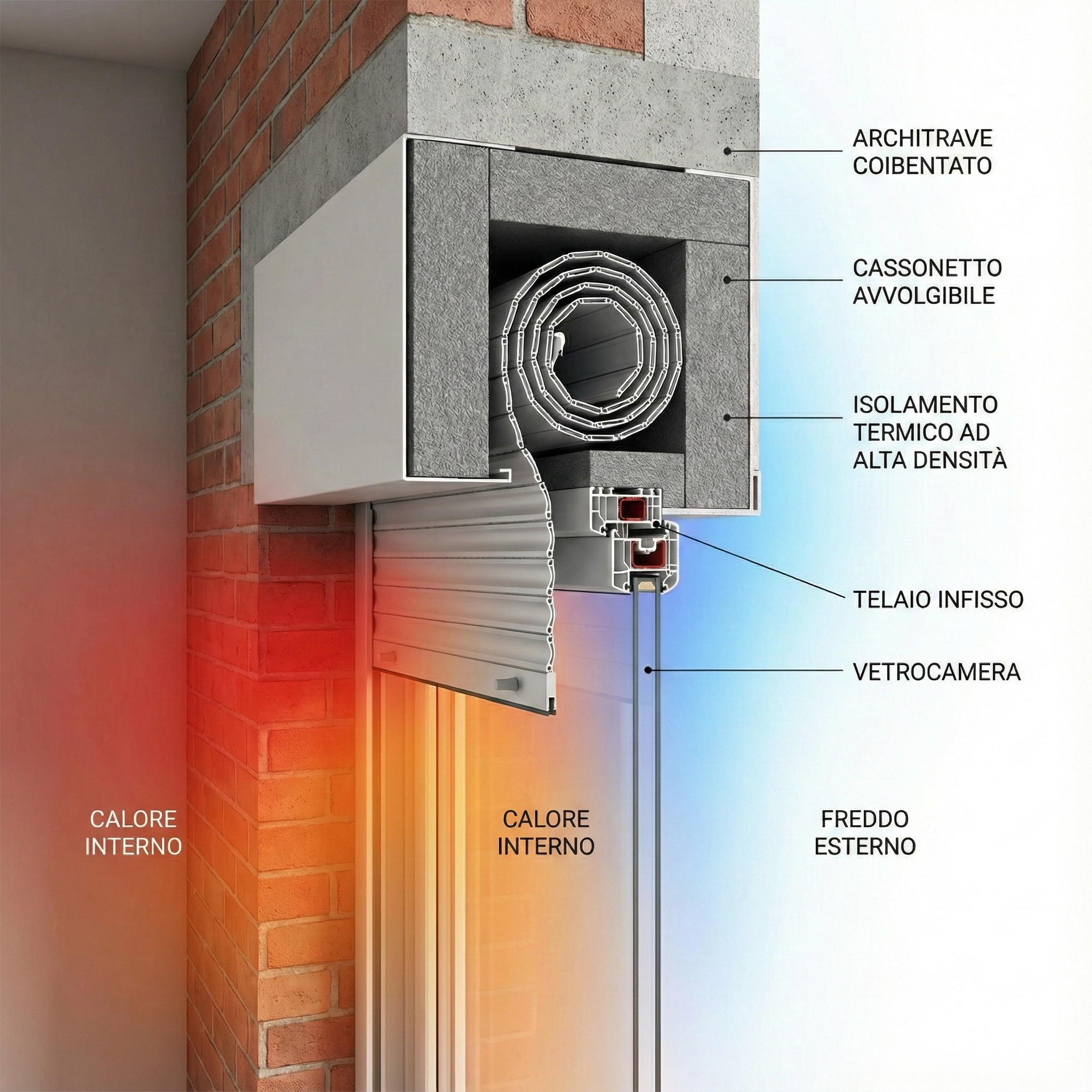 • Isolamento ad Alta Densità (Parte Grigia): Inseriamo pannelli termo-acustici specifici all’interno del vano. Come vedi nello spaccato, questo materiale crea una barriera fisica che impedisce al freddo esterno di entrare in contatto con l’aria calda di casa.